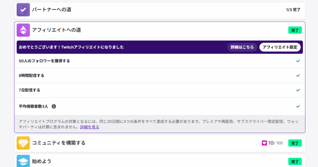 これら4つの要件(アチーブメント)を達成することができればTwitchアフィリエイトになることができるをこと知ったのやまるちゃん。