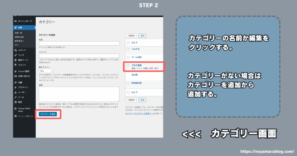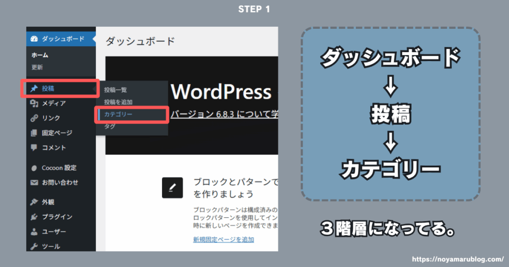- STEP 1WordPressの『ダッシュボード』から【投稿】→【カテゴリー】を選択。