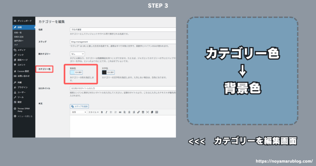 - STEP 3カテゴリーを編集という画面から『カテゴリー色』→【背景色】から変更。