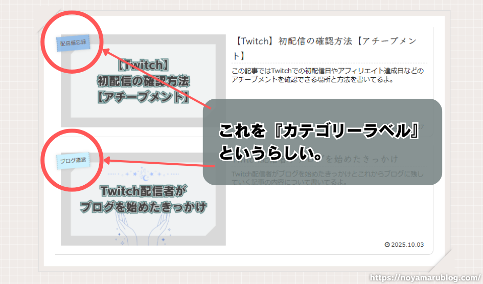 このサムネの左上にカテゴリーの名前が書いてある付箋みたいなやつが『カテゴリーラベル』というらしい。